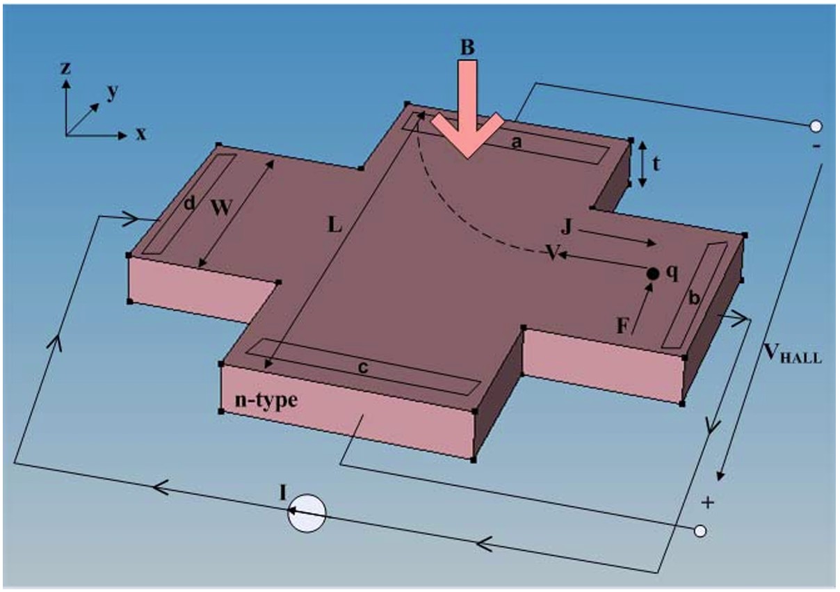 However, when a perpendicular magnetic field is applied, the charge carriers (electrons) flowing in the plate experience the Lorentz force. This force deflects the carriers toward one side of the plate. This accumulation of charge creates a transverse electric field that opposes further deflection, establishing a stable potential difference. This potential is the Hall Voltage, and it is directly proportional to both the bias current and the strength of the perpendicular magnetic field. This proportionality is the foundation of all Hall-effect sensing.