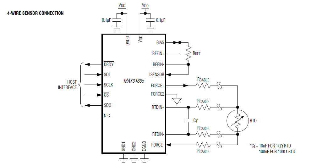 A single external resistor sets the sensitivity for the RTD being used, and a precision 15-bit delta-sigma ADC converts the ratio of the RTD resistance to reference resistance into digital form, for nominal temperature resolution of 0.03125⁰C °C and accuracy of 0.5⁰C under all operating conditions and extremes.